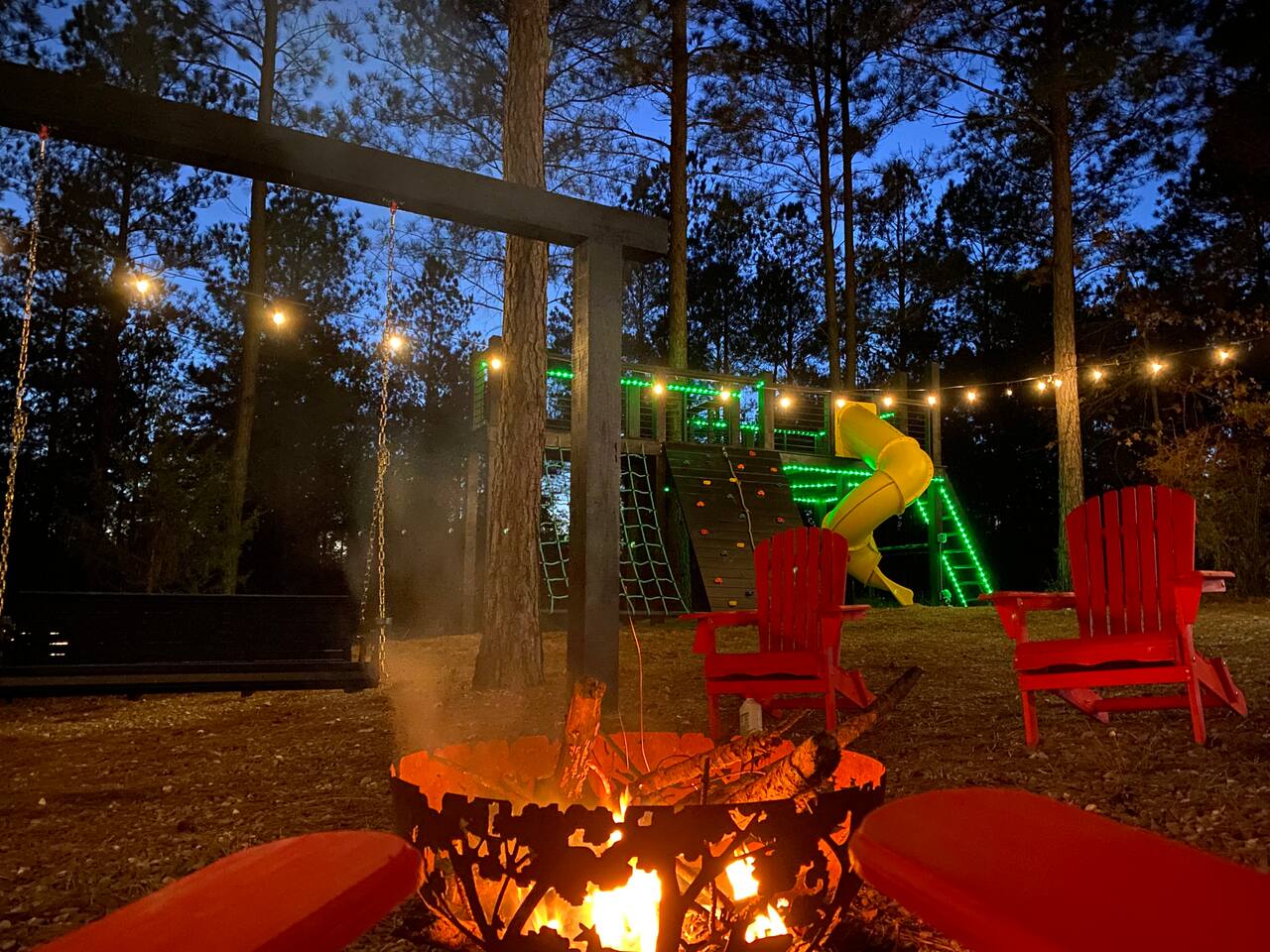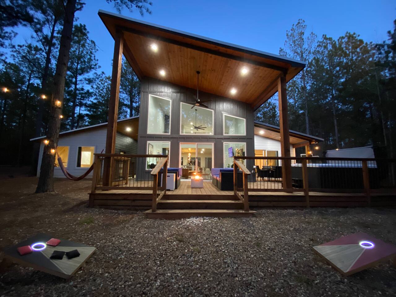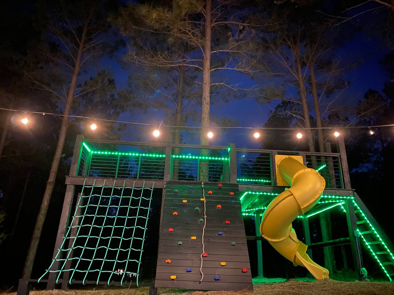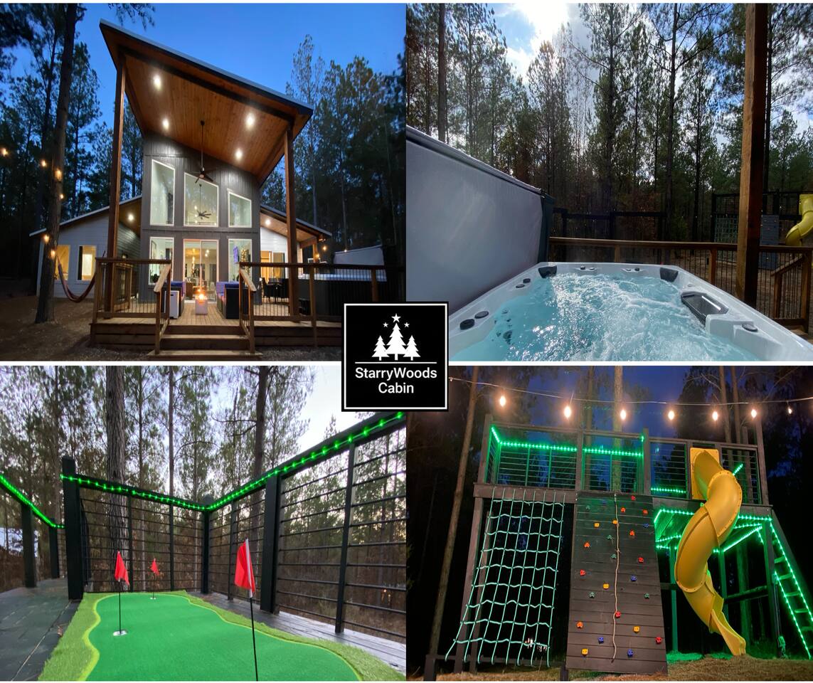 Fun Getaway for the whole family in Hochatown, OK! Short Drive to Beavers Bend State Park and Lake; ✔ Large hot tub under Pine Trees ✔ Arcade ✔ Golf putting green ✔ Wood burning Firepit ✔ Climbing wall ✔ Slide for kids but big enough for dad to use it too ✔ Multiple Hammocks & swings ✔ 2 hanging egg swings in entryway ✔ Duo Keurig coffee maker (carafe and single pod) ✔ Smart TVs in every bedroom, living room, each kids bunks and one outdoor TV by the hot tub. ✔ Shuffleboard
